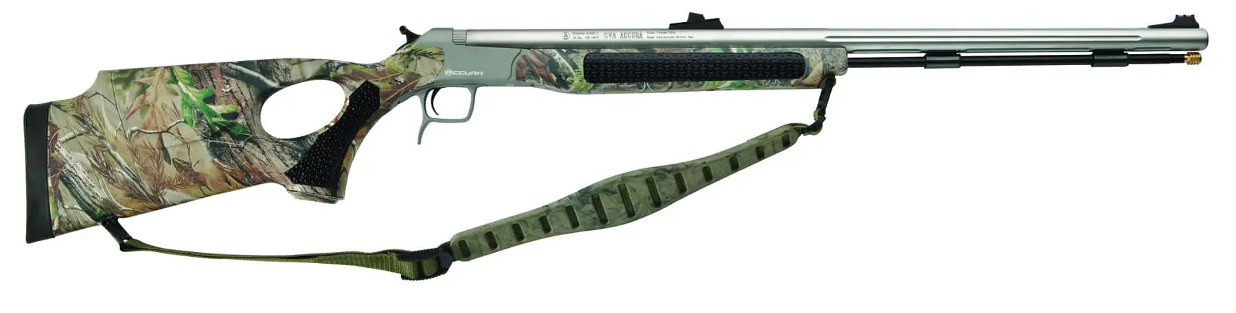 This firearm by CVA provides the right combination of balance, maneuverability and efficient powder-burning capability. It has a 30-inch stainless steel Bergara barrel with a bullet-guiding muzzle with 1:28 twist rifling. And, its breeching lever is built right into the trigger guard, making it easy to operate. The gun’s ergonomically designed stock, whose Soft Touch coating and rubber grip panels make it comfortable and secure in the worst of weather, is fully ambidextrous and available in both standard and thumbhole designs. The entire gun can be disassembled by removing just one screw. Other features include a one-piece scope mount, a quick-release breech plug, reversible cocking spur, and more. The .50-caliber gun costs about $585.