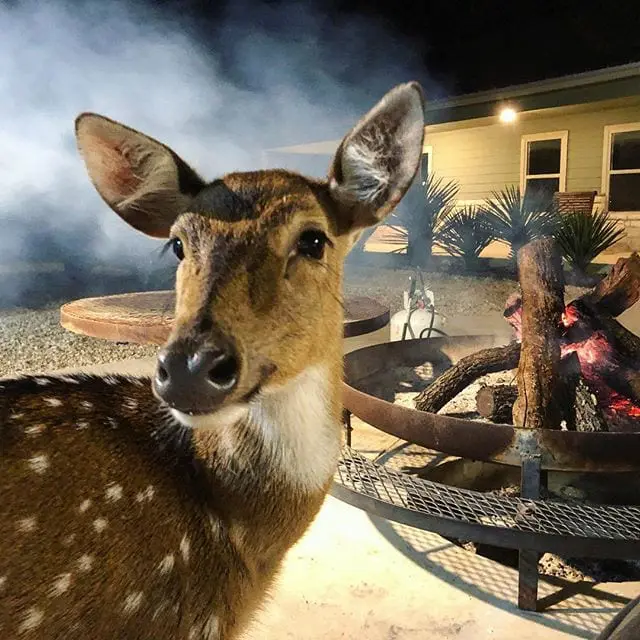 Annie the Axis listening to deer hunting stories around the campfire #deerhunting #axisdeer #axis #campfire