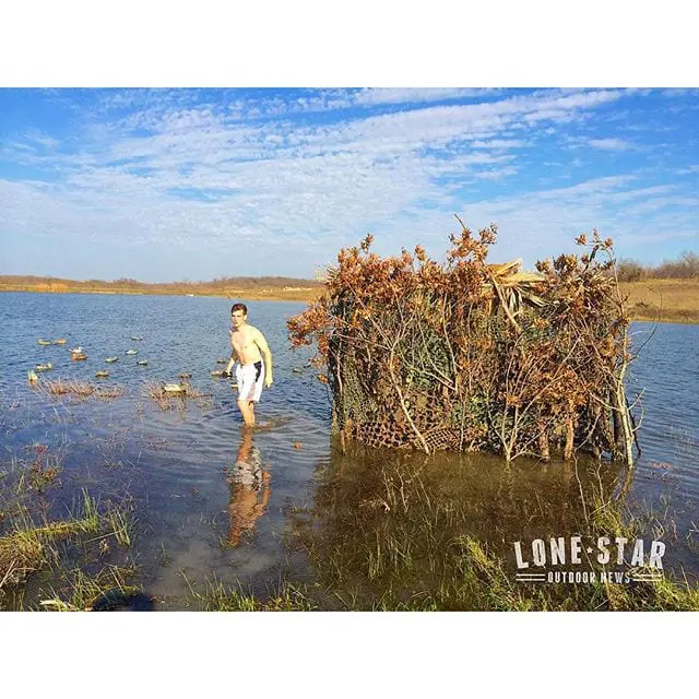 Brushing the blind in his bathing suit getting ready for a Christmas morning hunt. #lonestaroutdoornews #duck #duckhunting #duckseason #academy #cabelas #texasweather #weather #christmasweather #hunting