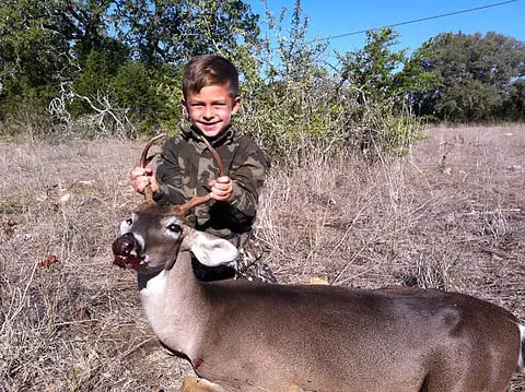 Today’s hero is Tino Malouf, 6, of Boerne. Tino was guided by his dad on his first deer hunt last October in Blanco County. They stalked into range and Tino shot this six-point buck at 90 yards from the prone position with a .223-caliber rifle.