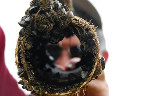 Zebra mussels live and feed in many different aquatic habitats, breed prolifically, and cannot be controlled by natural predators. Adult zebra mussels colonize all types of living and non-living surfaces including boats, water-intake pipes, buoys, docks, piers, plants, and slow moving animals such as native clams, crayfish, and turtles. The U.S. Fish and Wildlife Service estimates the potential economic impact of zebra mussels to be in the billions of dollars.