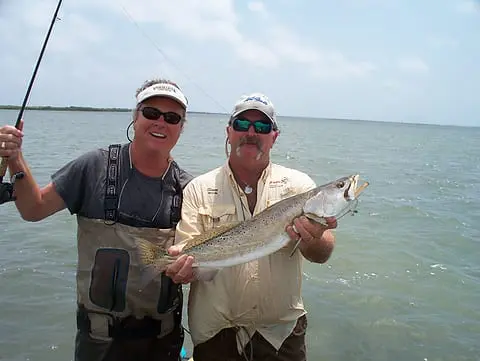 Today’s hero is Phil Gatton. Here, Phil, left, stands next to Rockport guide Scott Jones as he holds Phil’s solid trout. The trout was caught on a wade-fishing trip to the coast recently.