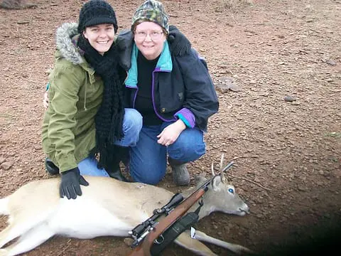 Today’s hero is Carolyn Usrey, left. She was all smiles Christmas Day when her Mom, Lora Weems, took her hunting. Carolyn used mom’s .257 Roberts and harvested this spike buck at 80 yards. It was her first deer ever.