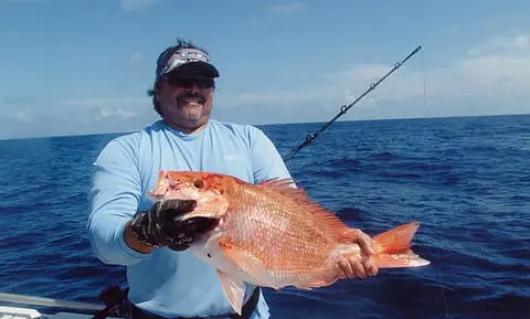 Today’s hero is Dennis Basaldua, who caught this nice red snapper 225-feet deep 65 miles offhsore aboard the Fish + Fun II.