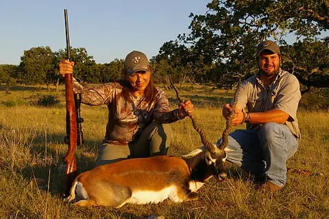 Today’s hero is Yvonne Miller, along with guide/outfitter Trapper Burkett with a trophy blackbuck she shot recently near Fredericksburg.