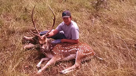 Today’s hero is Jarrett Robertson, 15, who shot this nice mature Axis on his home property at the end of June in Gillespie county. He enjoys hunting exotics and was fortunate to take this one with his .243. He took a broadside shot at 80 yards for a clean kill. He was extremely excited. This is the second time in 4 years he has managed to take a summer Axis.
