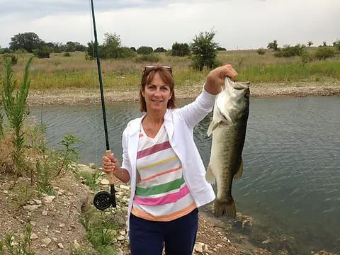 Today’s hero is Suzanne Hutchison with a 6 ½-pound bass she caught in July with a flyrod in Comanche County. She was fishing with a floating brown grasshopper.