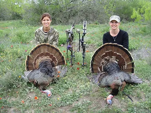 Today’s heroes are Cindy Osting, left, and Jenny Sanders. They hunted the South Zone turkey season this spring on the Temple Ranch in Duval County, where they connected on these two nice toms.