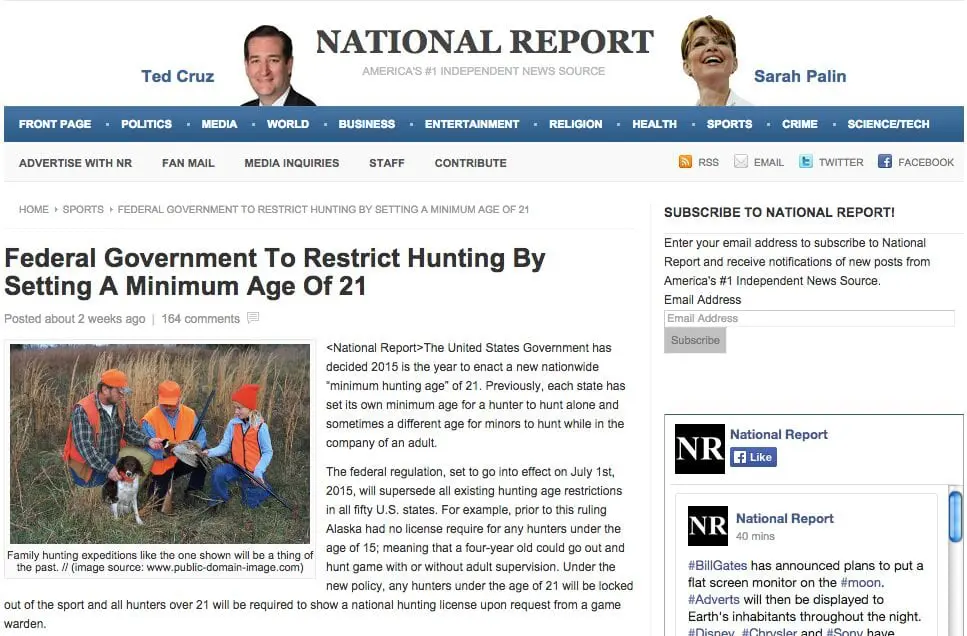 According to the debunking website Snopes.com, “the National Report article was presented like an authentic news story: It used a fabricated quote from U.S. Fish and Wildlife Service spokesman Gregory Pearson (who is not a real person) and cited a petition from the NRA (which does not exist). But since the writing resembled a professional news piece, many readers believed that it was true, and within a few days of its publication thousands of people had shared it on Facebook.