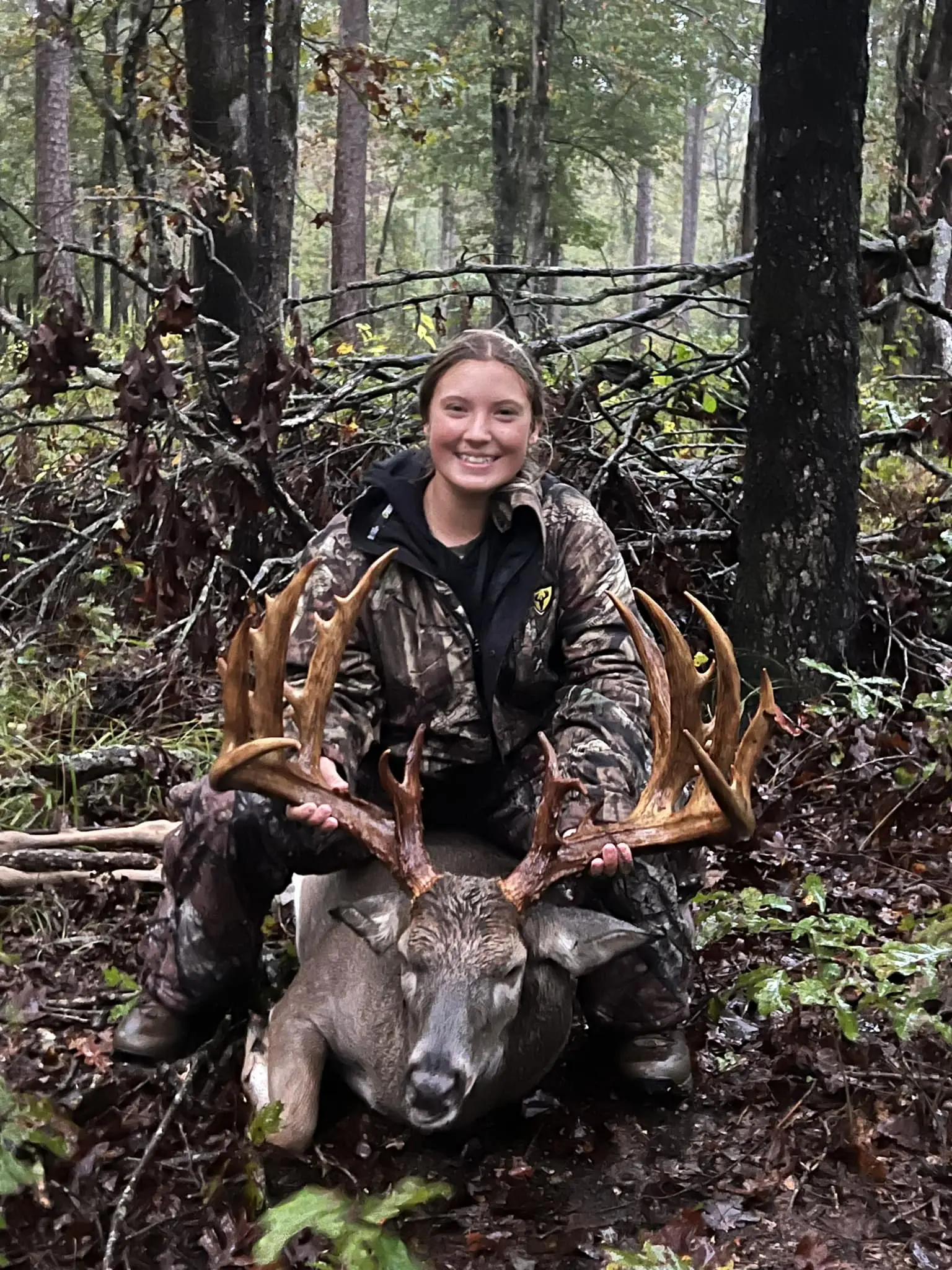 “It was only 15 minutes after he left,” she told the podcast. “The buck was walking down the trail. I only saw his right shoulder. He shook his horns, and I saw the water fall and got nervous. My scope was fogged up and I wiped it with my hoody and put it on him. I breathed and barely squeezed the trigger. He was 35 to 40 yards out. He ducked his head, walked off and then fell.”