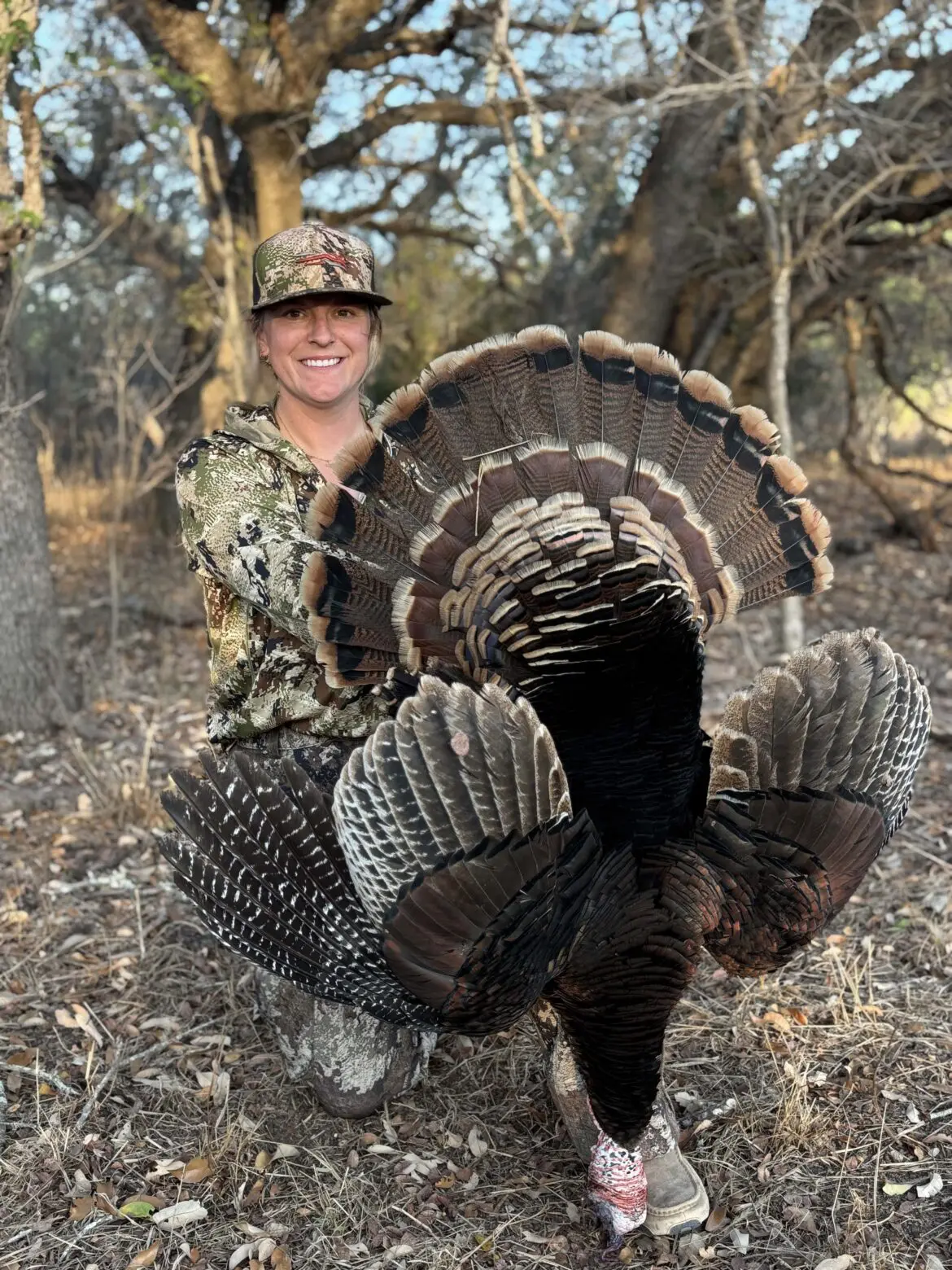 Moments after she pulled the trigger, Zach took another gobbler that had come within shotgun range, and the couple doubled up on boss birds. “We started our hunt early in the afternoon on a property in Bandera County that just seemed to be dead and void of action,” Montalvo said. “We covered a lot of ground and never saw or heard a bird. Our plan was to wait the birds out, in hopes that they would start talking later in the afternoon. Then, my husband got a text from his partner with 4-C Outdoors, who had put some eyes on some gobblers on a different place where they hunt in Medina County. So we packed up and headed that way.”