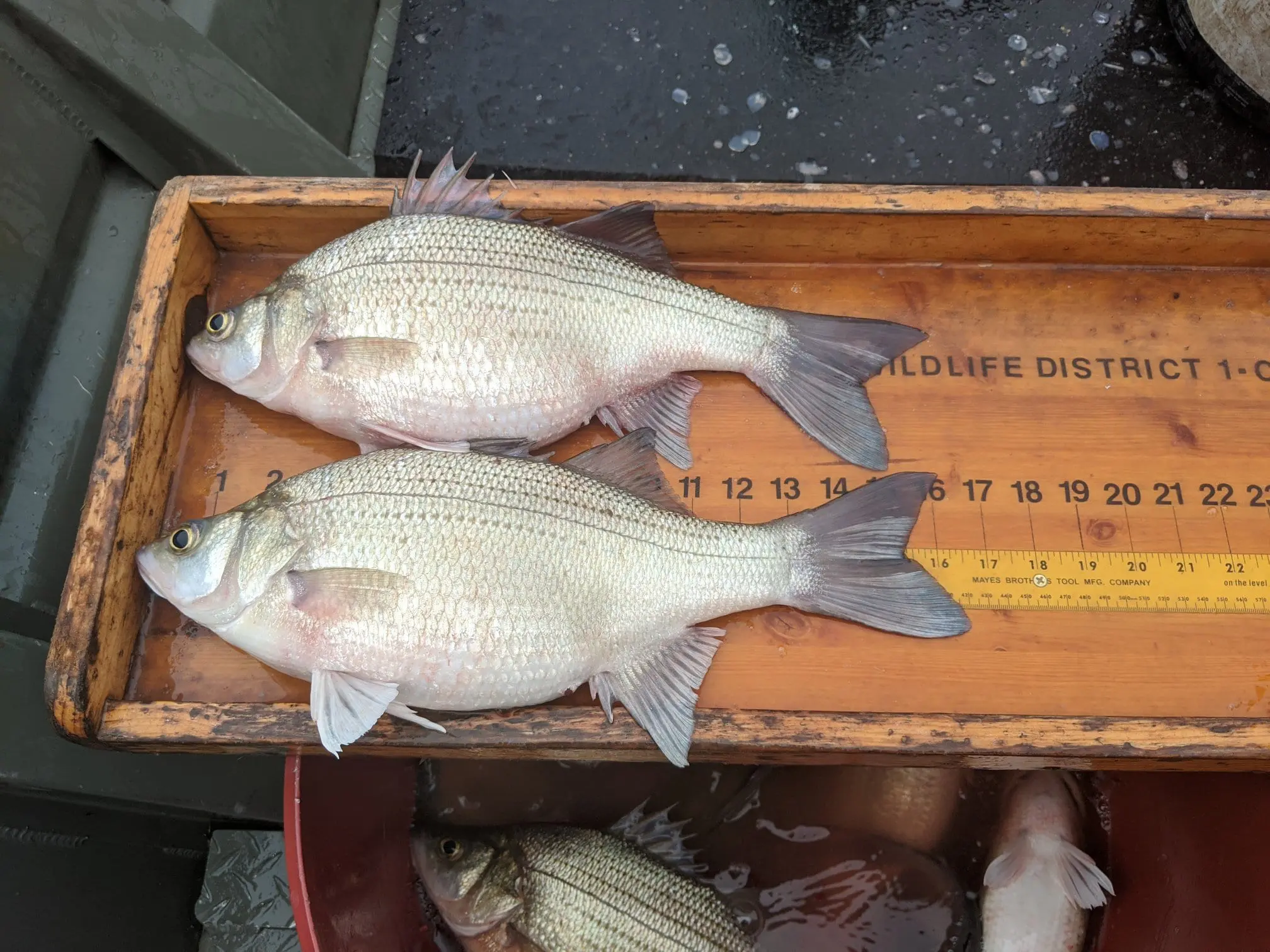 The huge white bass caught their attention. They sampled 6 bass that were over 2.5 pounds, with the largest at 17.9 inches and 3.27 pounds. Two of the white bass sampled would have beaten the current lake record of 2.7 pounds.