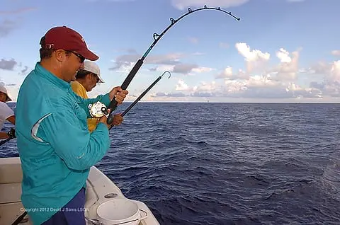 “We were trolling for marlin 75 miles out in a bunch of grass, going kind of slow at only 7 knots,” he said. “I was reeling in and my pole started bending five feet from the boat, so my first thought was that he had wadded up on a bunch of grass.”