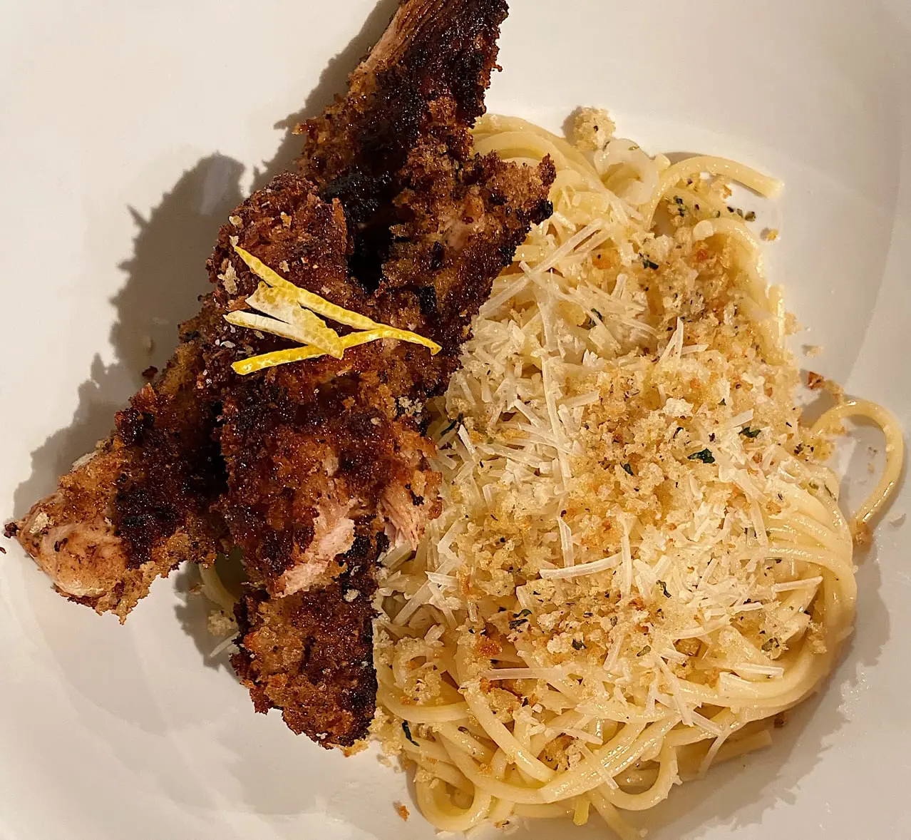 Brine the turkey breast for at least an hour before handling. Pat the turkey dry and cover with wax paper. Pound out the breast until it doubles in size and has an even thickness all the way around. For smaller portions of turkey, cut into strips. Season liberally on all sides with fresh minced garlic, salt, pepper, lemon zest. Prepare three small bowls, one with flour, one with breadcrumbs and one with beaten eggs. Drench the rolled turkey in the flour, then egg, then breadcrumbs. Dress with more lemon zest. Put drenched turkey in the freezer on a sheet pan for 15-20 minutes.