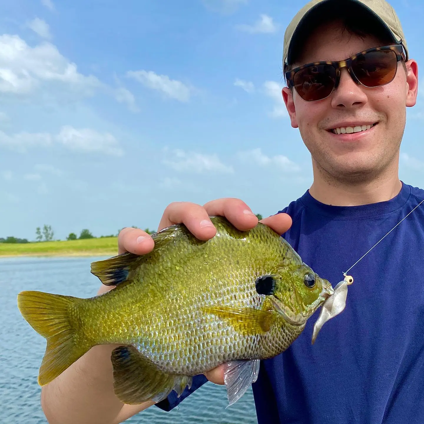 The group of 4 caught about 45 bass and this massive “man-sized” bluegill.  Which means bass food for days in that pond.Â