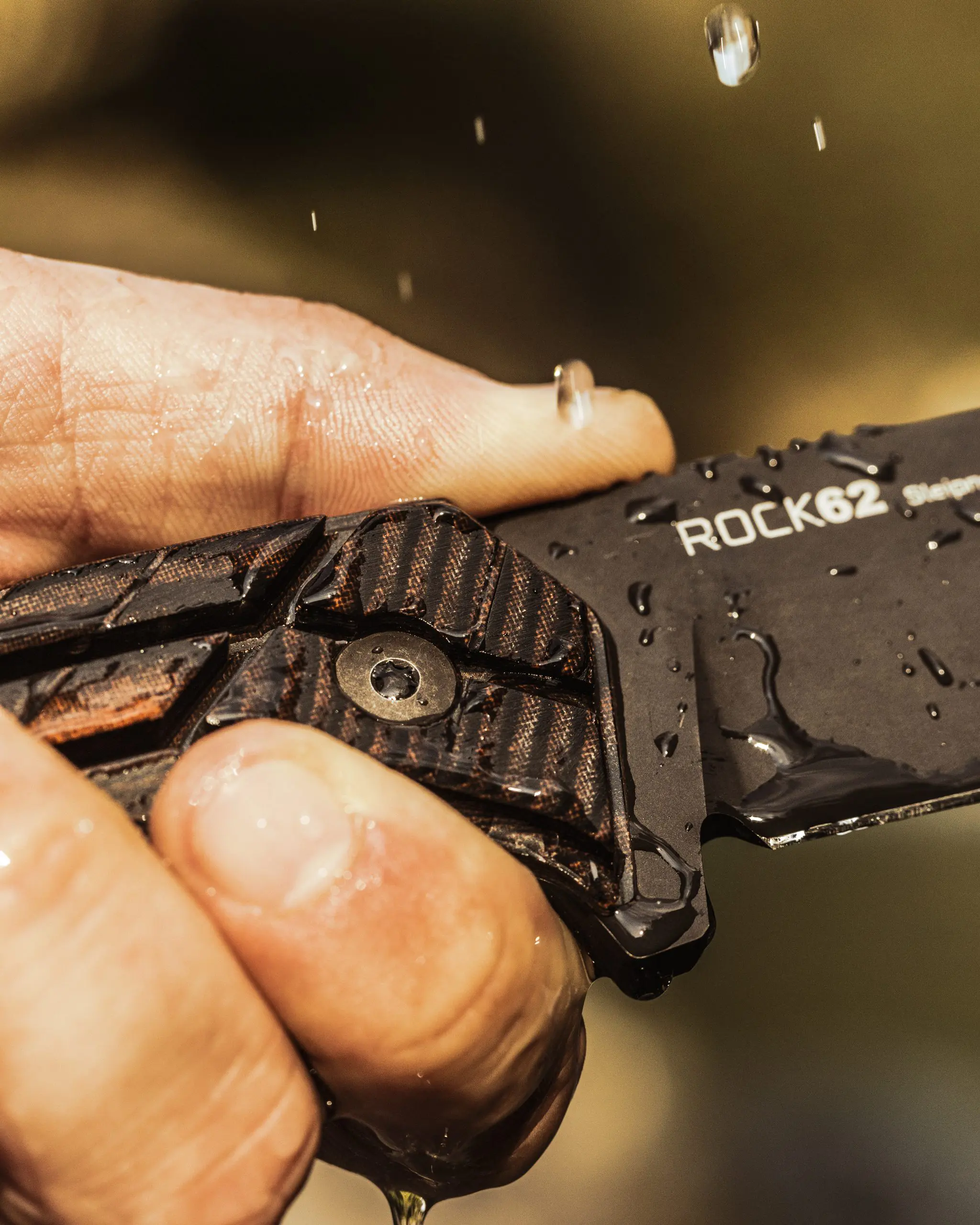 Following the successful launch of the original Rock62 knife, this latest model in the line features the innovative X-Grip Technology. Gaining inspiration from the legendary Pirelli tires, X-Grip Technology is designed with grooves and threads that help fluids naturally and quickly flow away from the handle. Fluids such as water and blood, as well as mud and other liquids get displaced 10-times faster than with conventional handle designs. Thus, the new Rock62 X-Grip Technology knives offer superior grip and handling in any environment or weather.