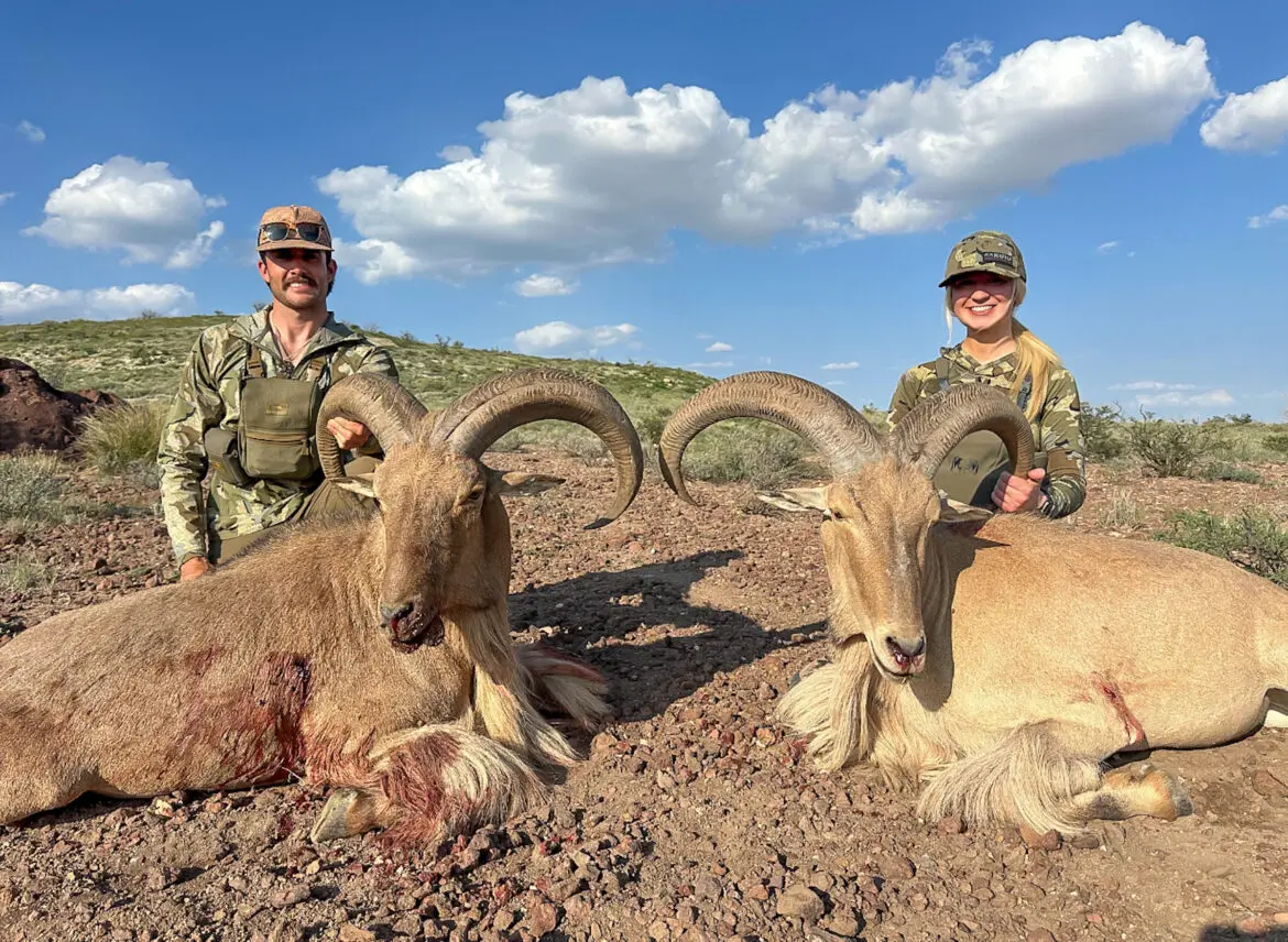 Cooper Mcfadin and Courtney Purvis recently made a 4-mile hike up a west Texas mesa in Brewster County, south of Alpine, in pursuit of aoudad. A diamond ring also made the trek uphill in Mcfadin’s pocket. On their 4-mile descent, they both carried rams on their backs, while the diamond ring rode on Purvis’s left hand. Not only did they double up on mature aoudad rams, but they also got engaged.