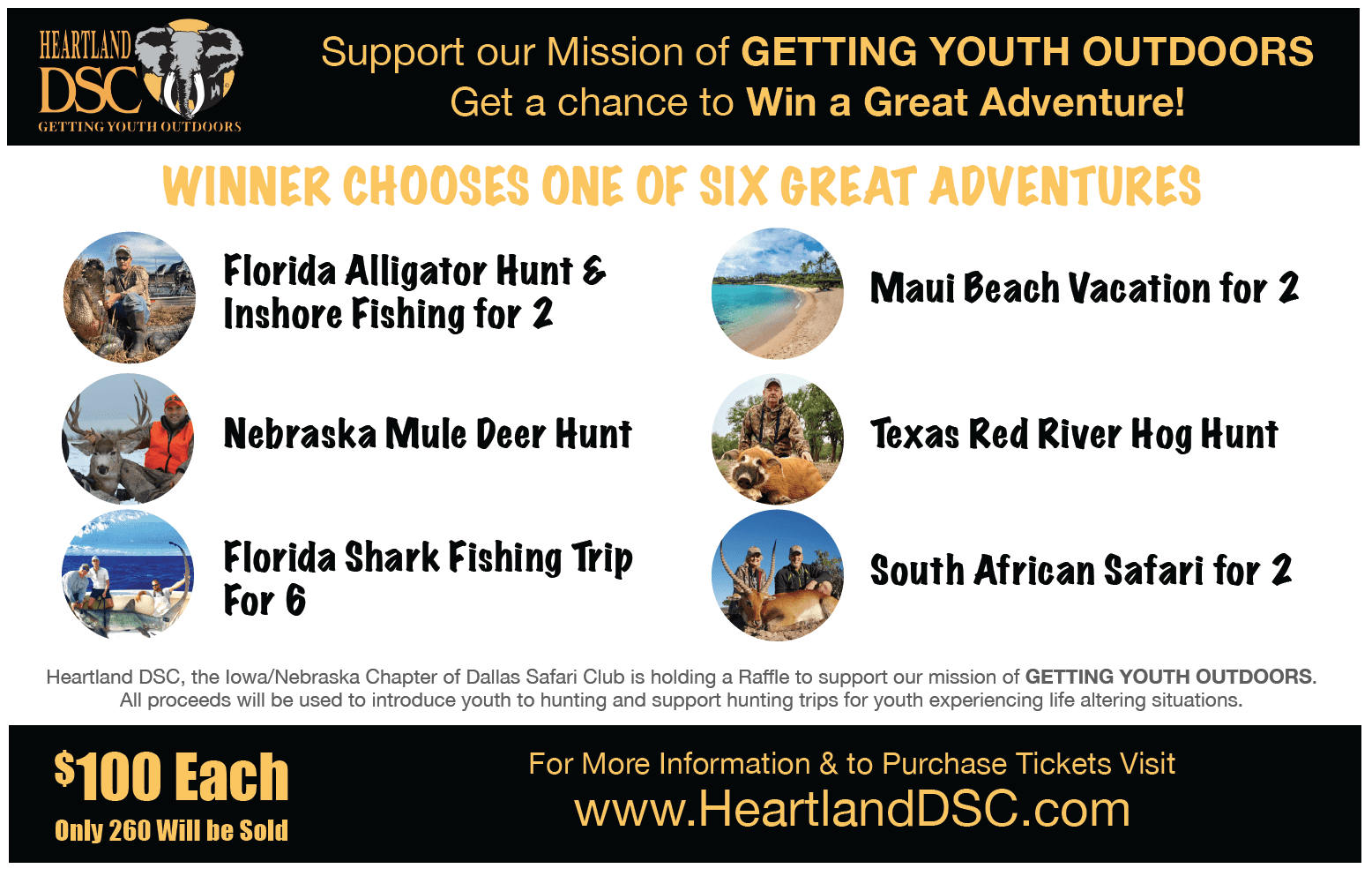 From fishing clinics, hunter safety courses, hands-on wildlife encounters, hunting and fishing opportunities, it’s all about the kids for Heartland DSC. Help support this wonderful organization with their “Pick Your Adventure Raffle.” Winner will choose one of 6 amazing adventures from an alligator hunt in Florida, a Hawaiian beach vacation, a mule deer hunt in Nebraska, a Florida shark fishing adventure, a Texas hog hunt to an African safari!