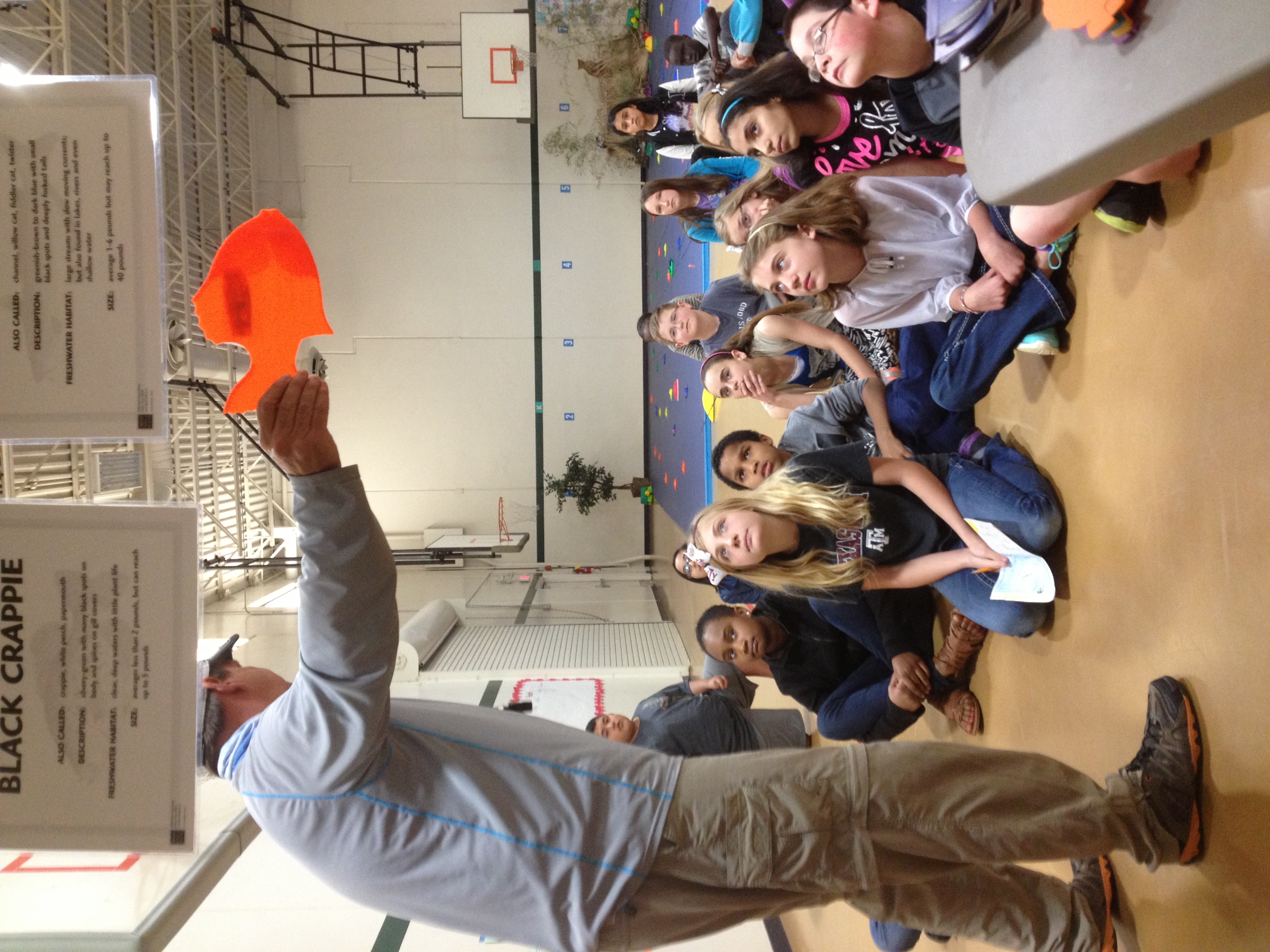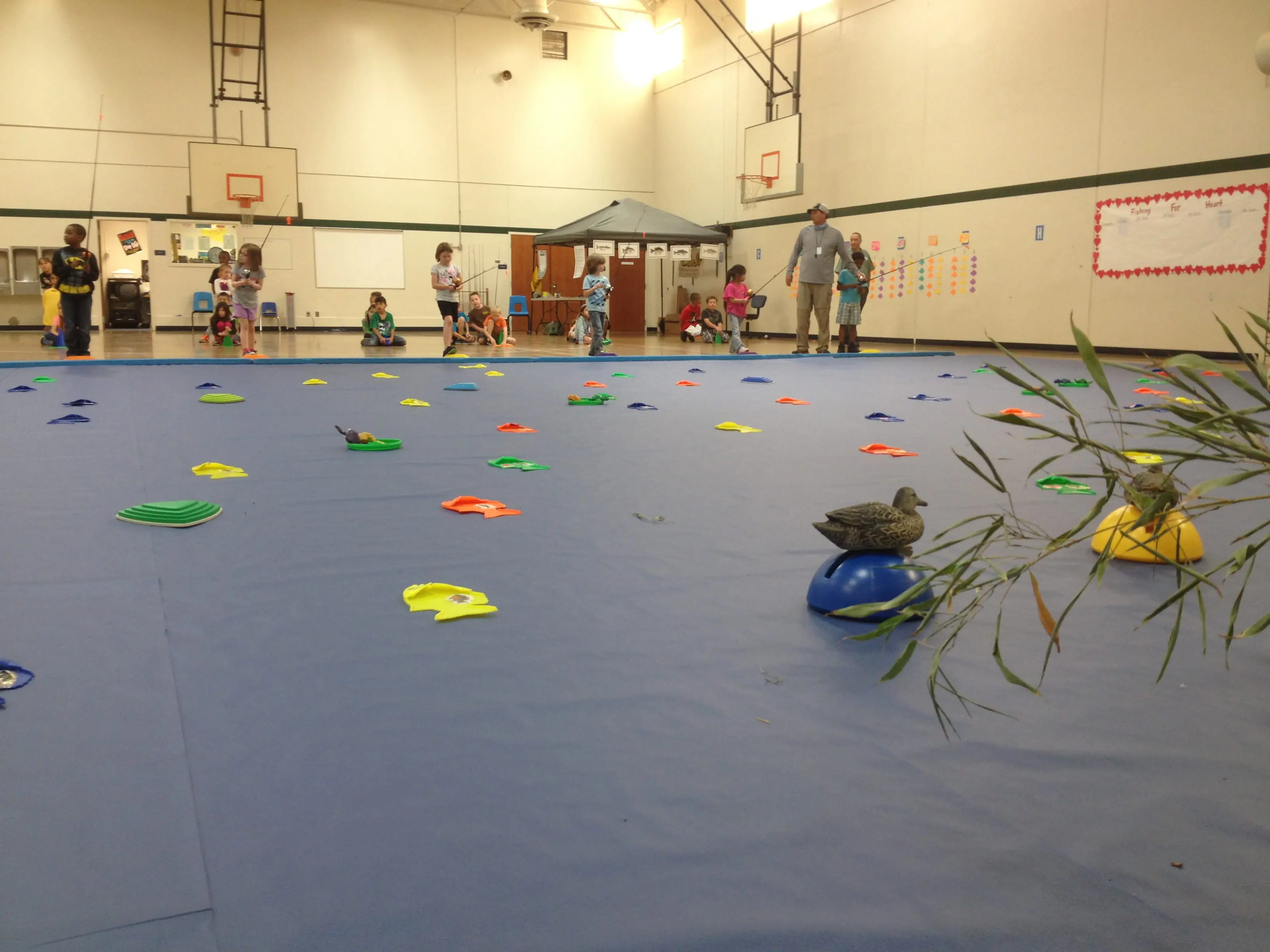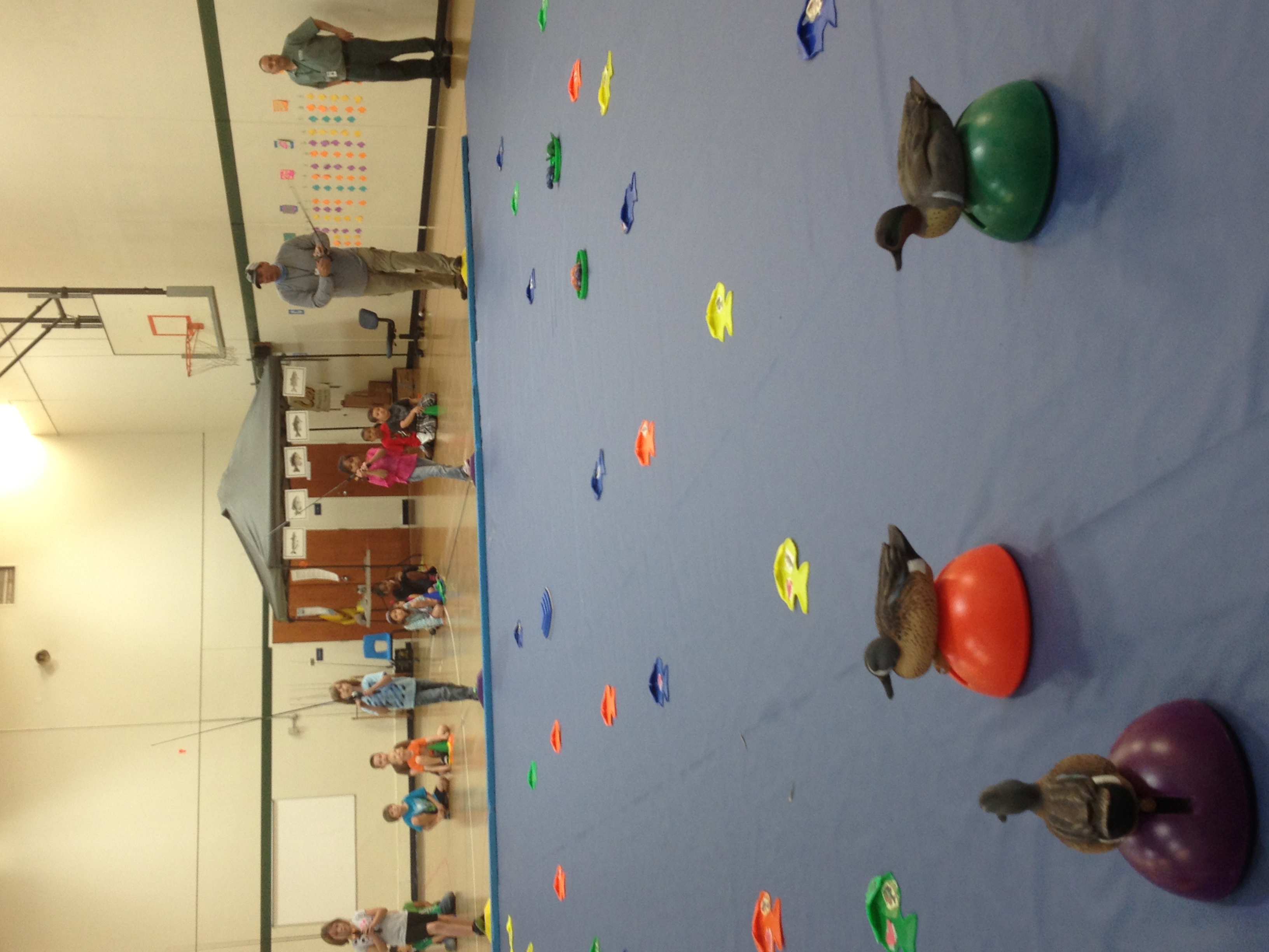 Metheny puts blue paper down on half of the gym, along with structure in the pond, duck decoys, a bobcat decoy and other enhancements to make the experience as lifelike as possible. The rods are baited with a small plastic fish that fits into the fish being caught on the pond. Once “hooked up,” the kids reel in their catch, identify the species and record their catch.