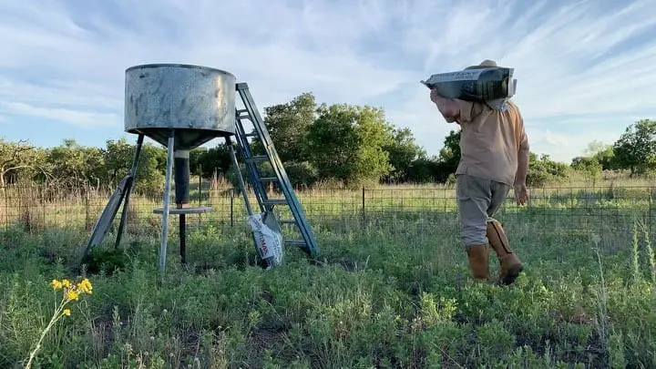 Topping off the feeder with Purina AntlerMax protein. The Climate Guard must be working because the deer are eating like crazy. Did you catch me spaying the yellow jackets after I got stung? #ranchin