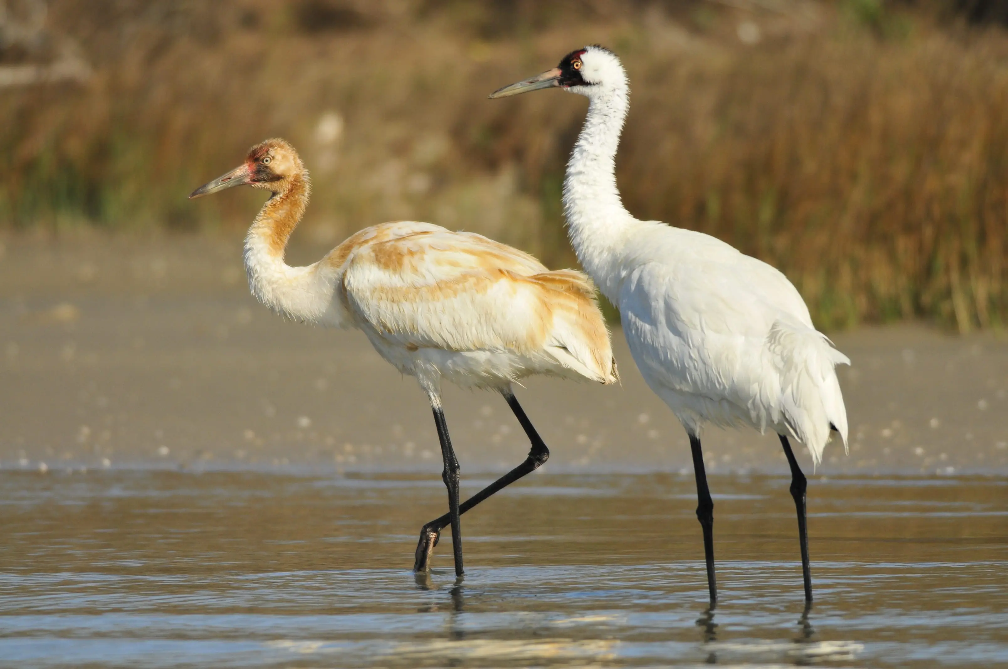 Whoopers are the tallest birds in North America, standing nearly five feet. The cranes are solid white except for black wing-tips that are visible only in flight. They fly with necks and legs outstretched. Each fall, they make a 2,400-mile migratory journey from Canada to the Texas coast. In the spring, they return north.