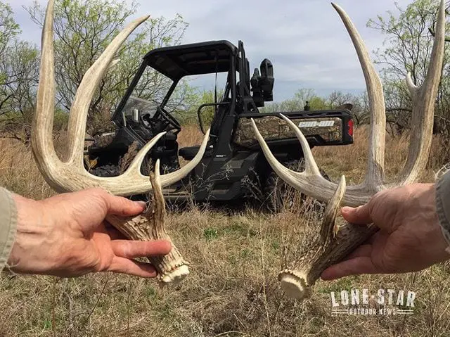 When you drive for seven hours and the only sheds you find belonged to the largest buck on the ranch, you are lucky! #lonestaroutdoornews #atv #canam #canamdefender #hunting #shedhunting