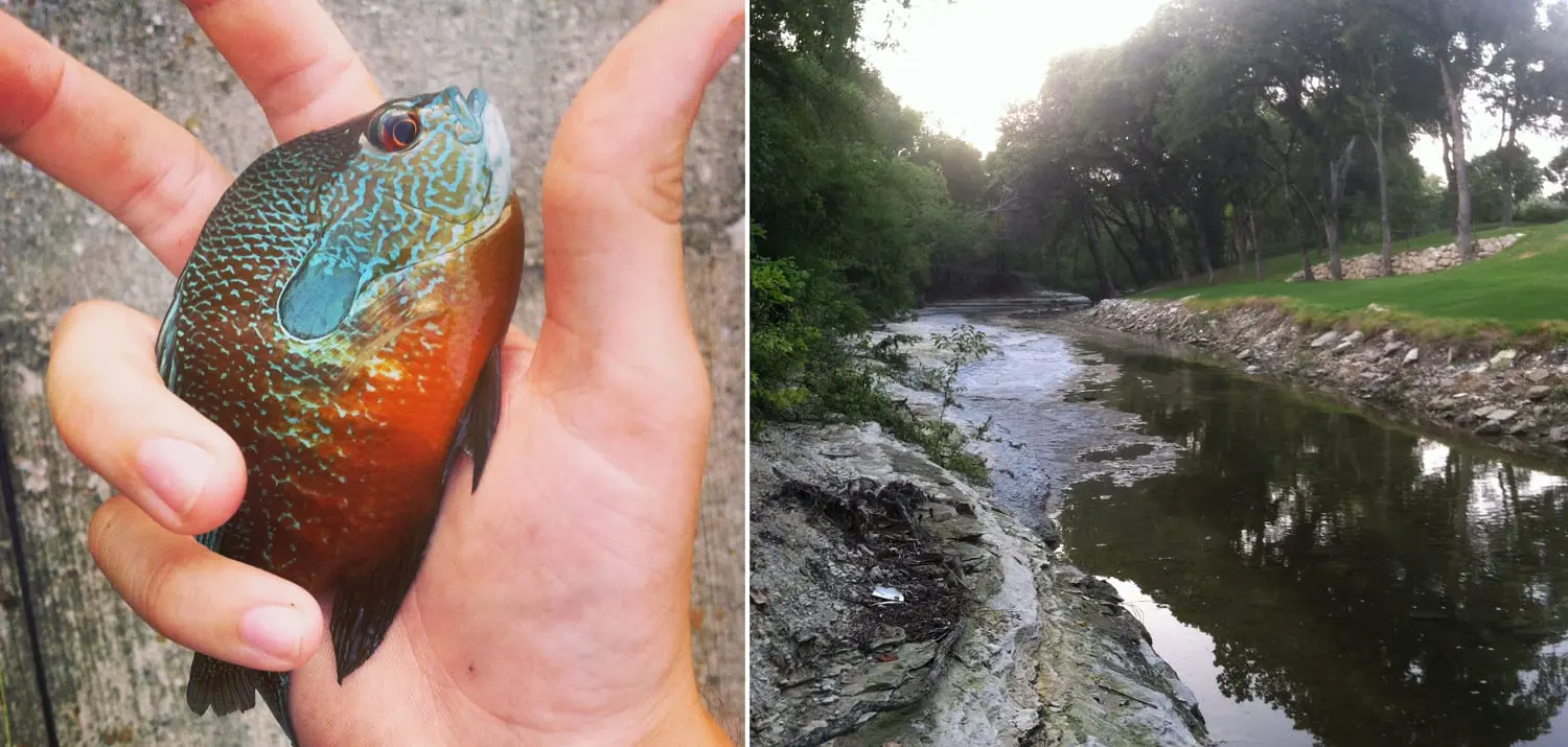 A “stream” in North Texas is also known as a creek, and generally you’ll find a fair amount of discarded shopping carts, trash bags and other undesirable obstacles blocking your path. This creek was no different, at first. Nonetheless, I managed to “haul” in some 4-inch sunfish almost immediately. Despite the lack of size, it was pure entertainment watching schools of tiny panfish fight over my fly at every cast — definitely not for the trophy fisherman, but hey, it’s better than nothing.