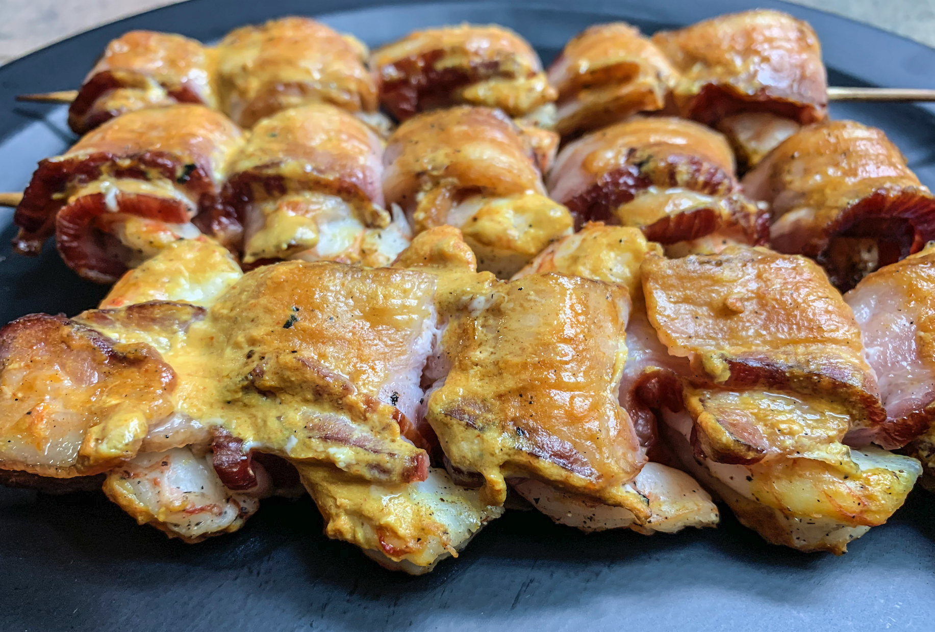 Grill on medium heat (300-350 degrees) for 10 minutes. Then, baste each skewer with the mustard/hot sauce mixture and flip. Baste the opposite side of the skewers with the mustard/hot sauce mixture. Total cook time should be 20-25 minutes, or until edges of bacon appear crispy and shrimp appear white.