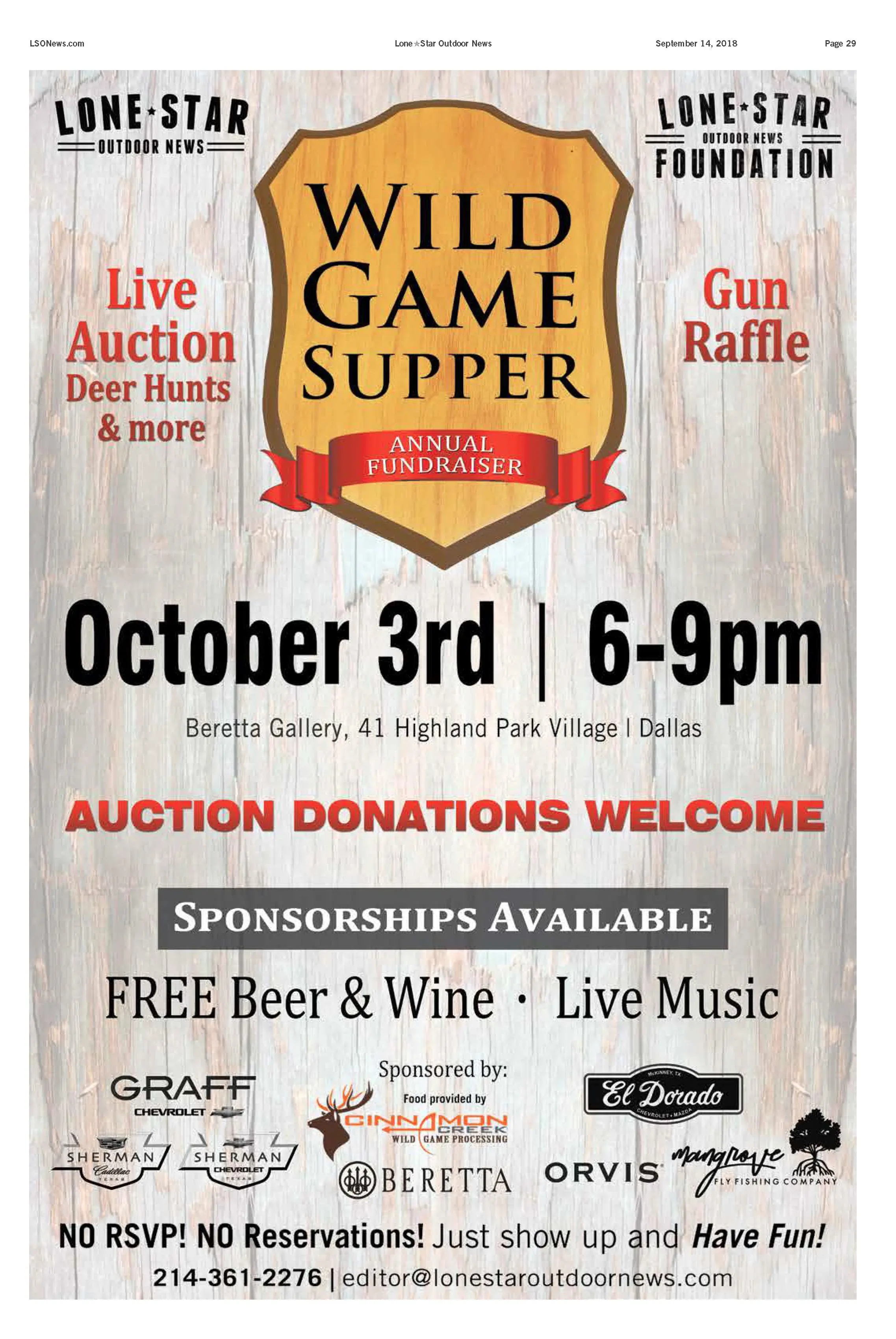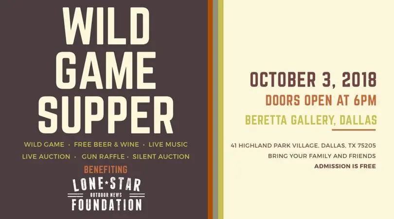 Lone Star Outdoor News will be hosting the annual Wild Game Supper at the Beretta Gallery in Dallas Oct 3 at 6 p.m. The event will benefit Lone Star Outdoor News Foundation.